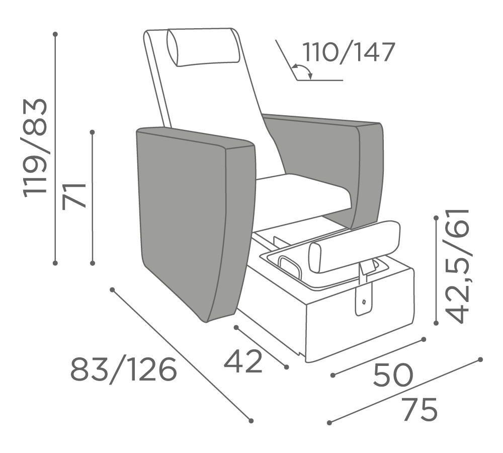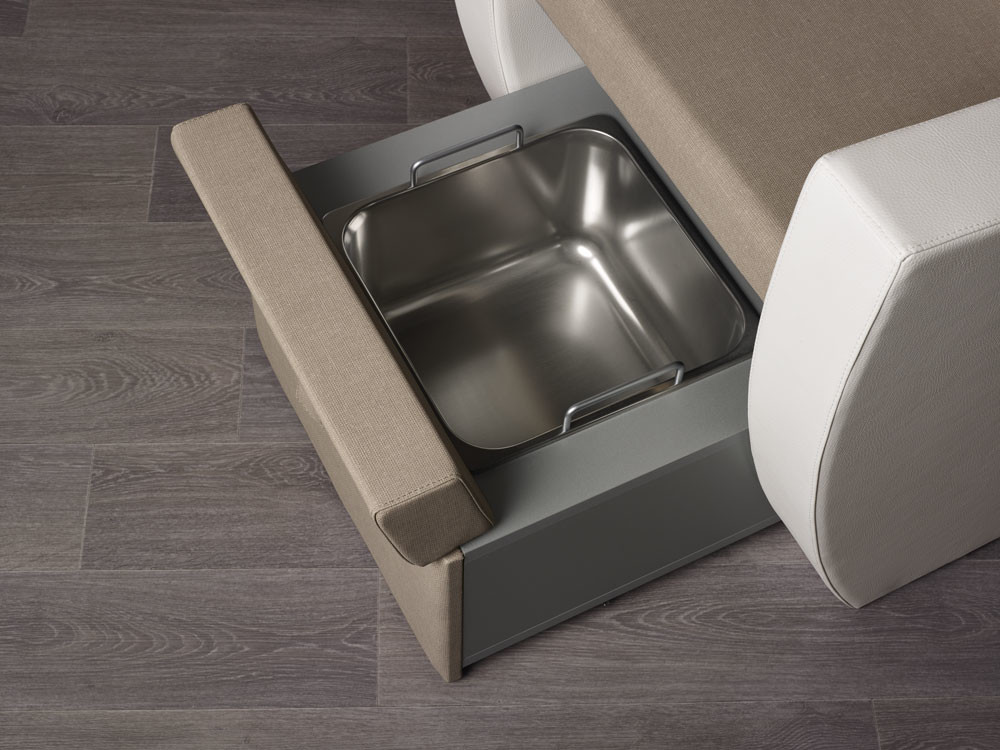 Contando sulla stupefacente comodità della poltrona Pacific, con schienale, seduta e braccioli imbottiti, Pacific, ha sotto di sè un cassetto nascosto con pannello frontale imbottito che può essere aperto, al cui interno si trova una vasca in acciaio inox estraibile per trattamenti pedicure. Attaccato al pannello frontale c’è un poggiagambe imbottito regolabile in altezza che offre una soluzione semplice e funzionale per trattamenti pedicure nel centro di bellezza. Il meccanismo di reclinazione manuale dello schienale, aggiunge comfort per il cliente. Pacific è disponibile in una scelta di Skai Colours , mono o bicolore, senza alcun costo aggiuntivo .