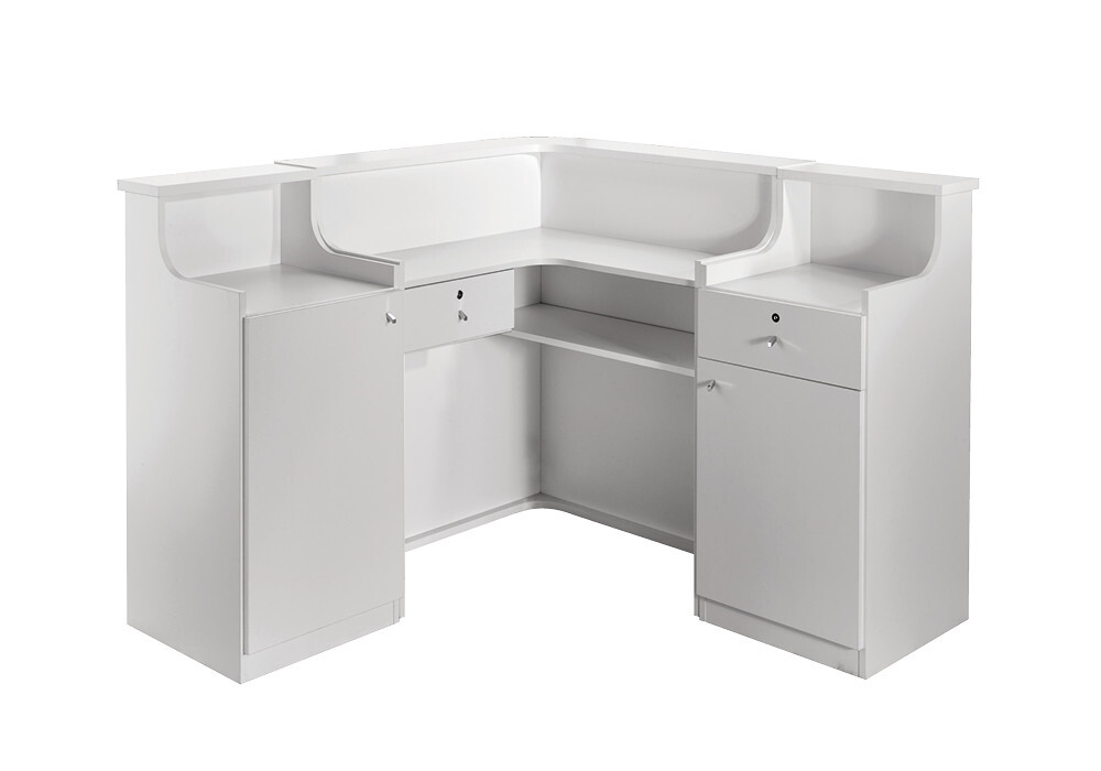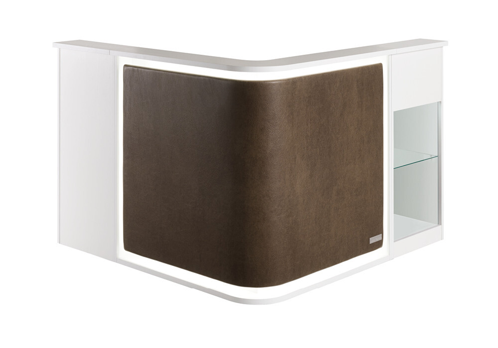 È arrivata la scelta intelligente per la tua zona reception! Quest’elegante reception in melaminico bianco frassinato cattura l’attenzione fin dall’ingresso nel salone, grazie all’illuminazione LED che cinge il pannello frontale tappezzato disponibile in una vasta scelta di colori senza costi aggiuntivi. Ma non solo! Componibile con mobiletti e vetrine laterali, e con una forma curva che disegna un angolo di 90°, rende possibile pensare collocazioni alternative e soluzioni “salva-spazio” per la zona reception del tuo salone.