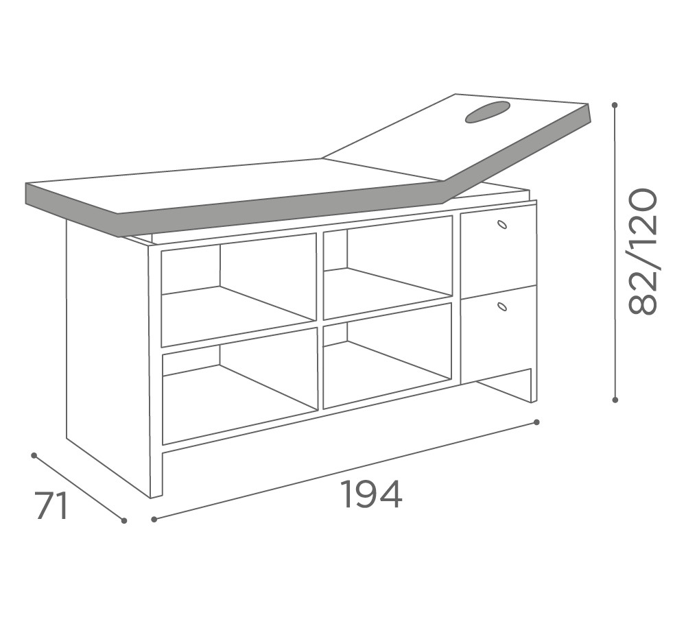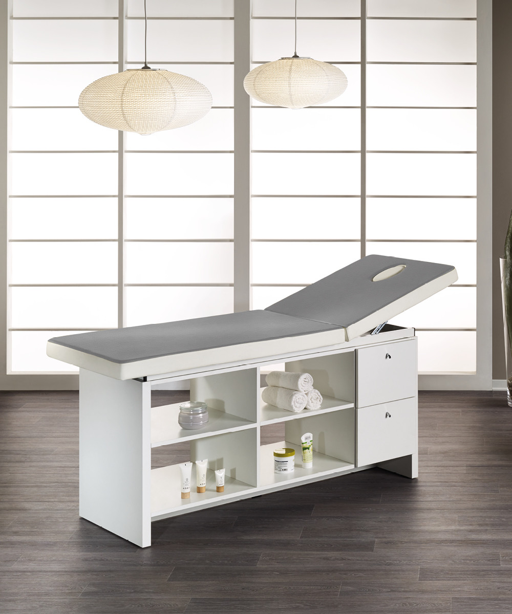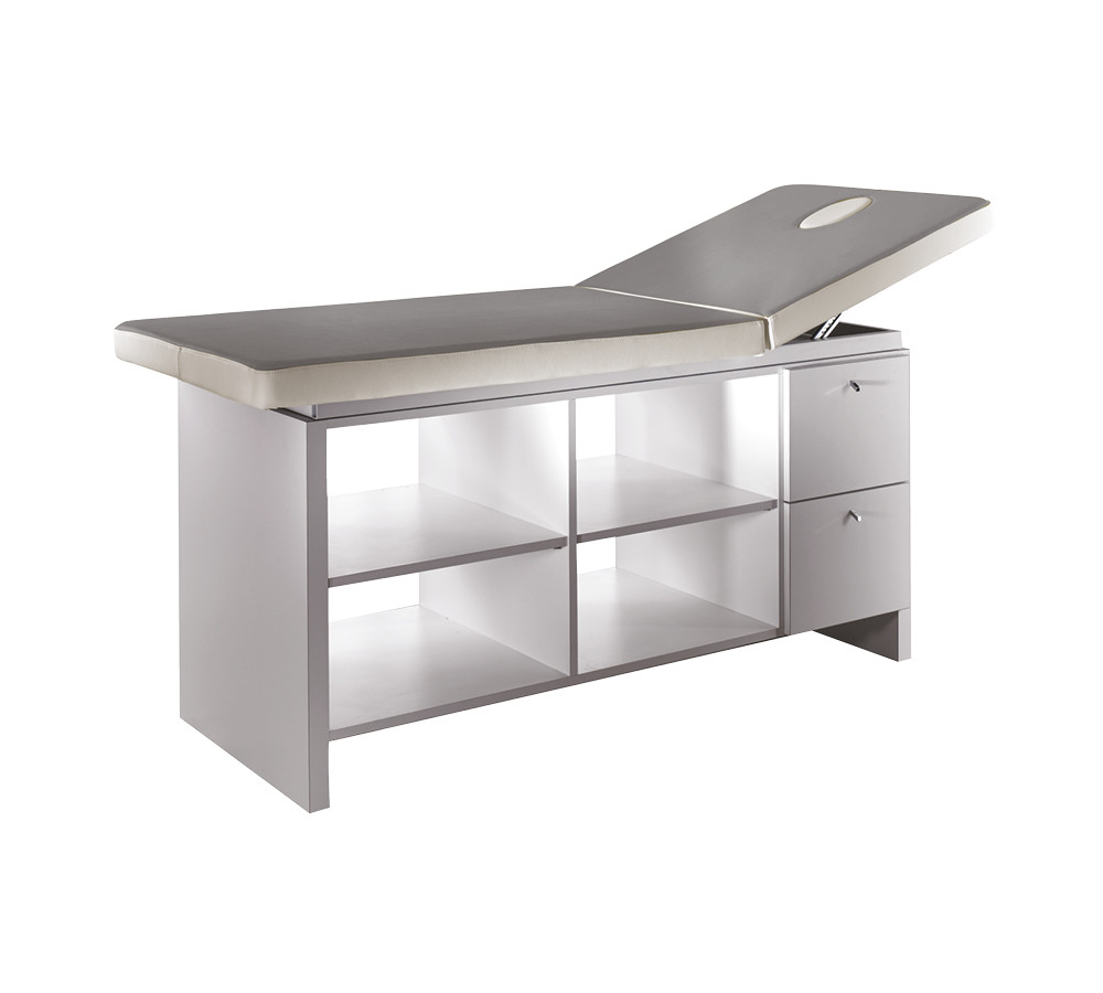 The Eden beauty and massage bed from Medical & Beauty combines practicality and comfort. With a thick, padded upholstered bed, with joint for raising the backrest and face hole, the Eden bed boasts a minimalist style that offers ample space for storage. The Eden in fact offers a robust structure in white ash melamine with plenty of cabinets and storage space.