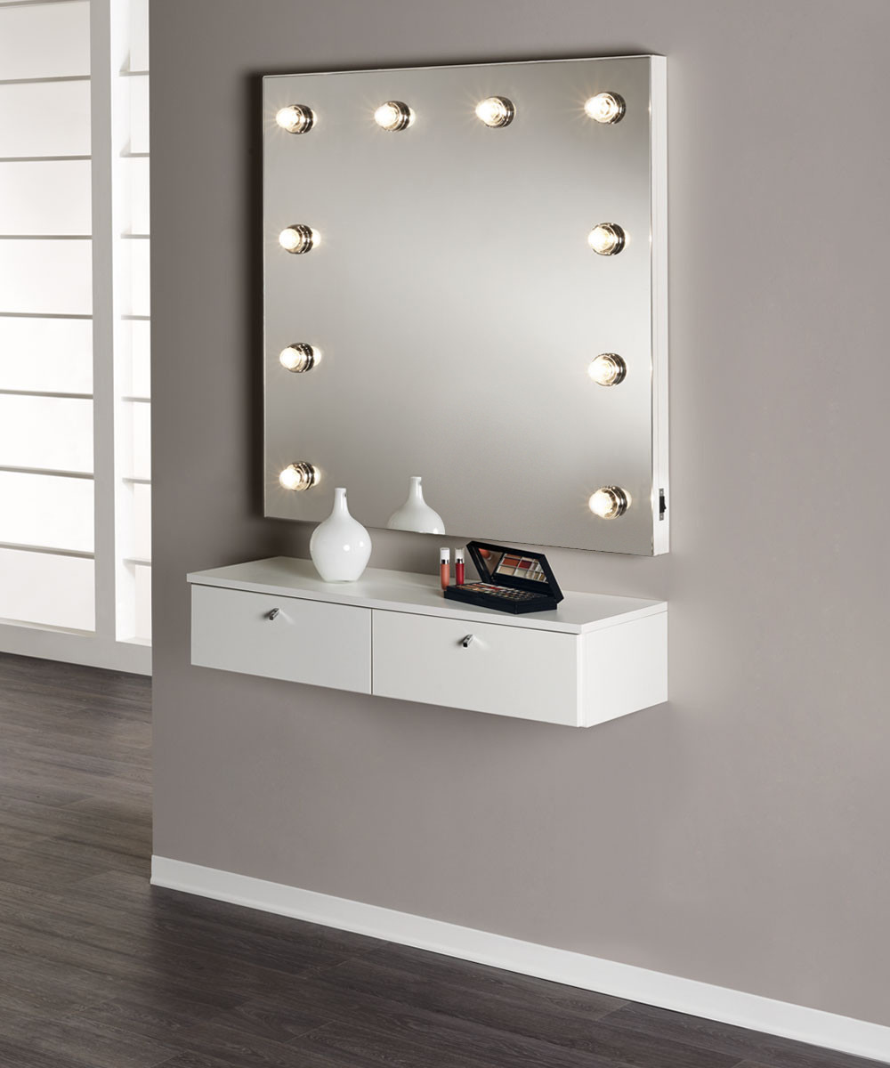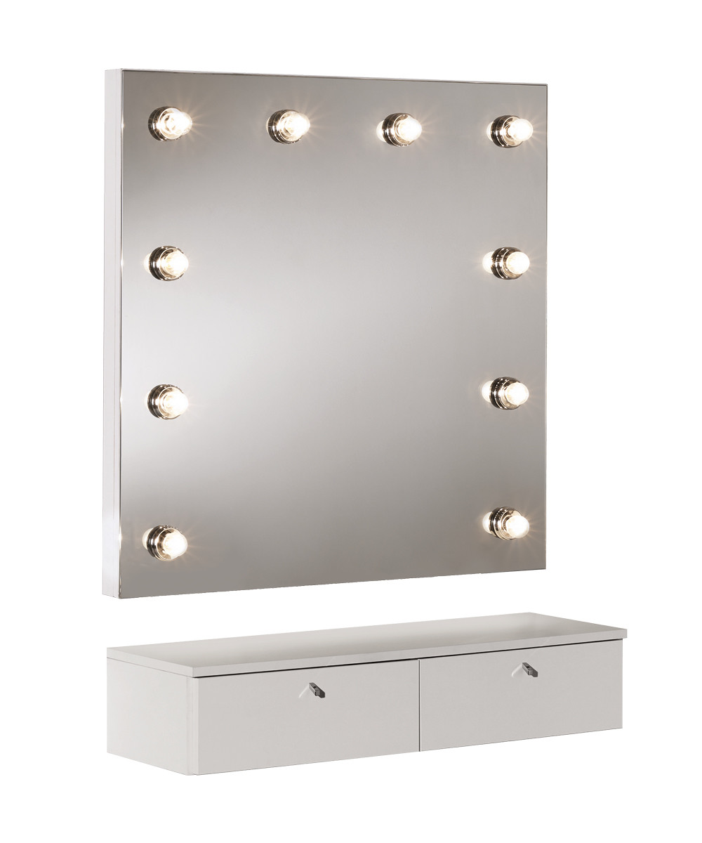 Make your client feel like a star with the Celebrity make-up mirror! This minimalist square mirror uses its large size to catch the eye, with 10 bulbs along the sides and top of the mirror creating a professional, well-lit workplace. Underneath the mirror, an elegant yet functional white structure with 2 drawers completes the stunning style.