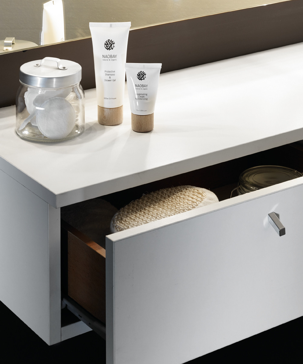 Make-up mirror with 2 drawers in white melamine and illuminated mirror that can be positioned either horizontally or vertically.