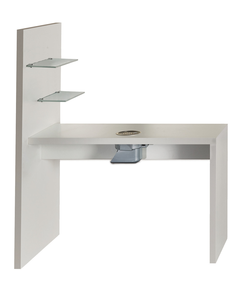 Finally, the simple and functional solution for the manicure area has arrived! The GLITTER manicure table presents a modern, clean, minimalist design. The essential style of a white ash melamine wood structure and side panel is completed by two stylish and practical glass shelves for displaying products.