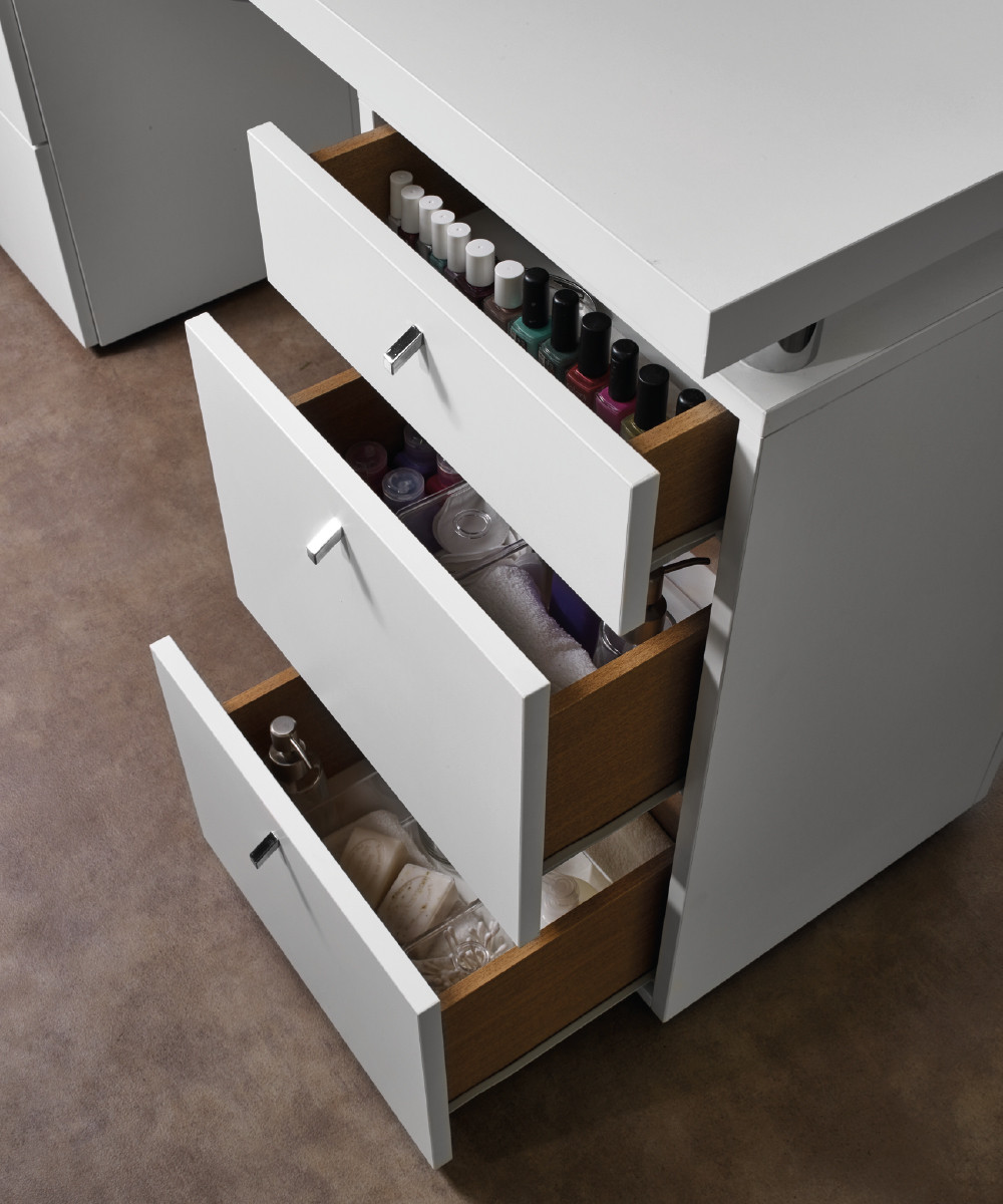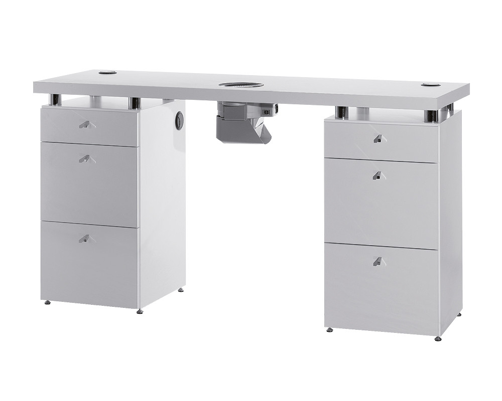 Large manicure table in white ash melamine, characterised by the thick, squared work surface with holes for wires. The two side cabinets are fitted with a small drawer and two larger drawers, and are connected to the top with chromed columns. An extractor fan is found in the centre of the work surface.