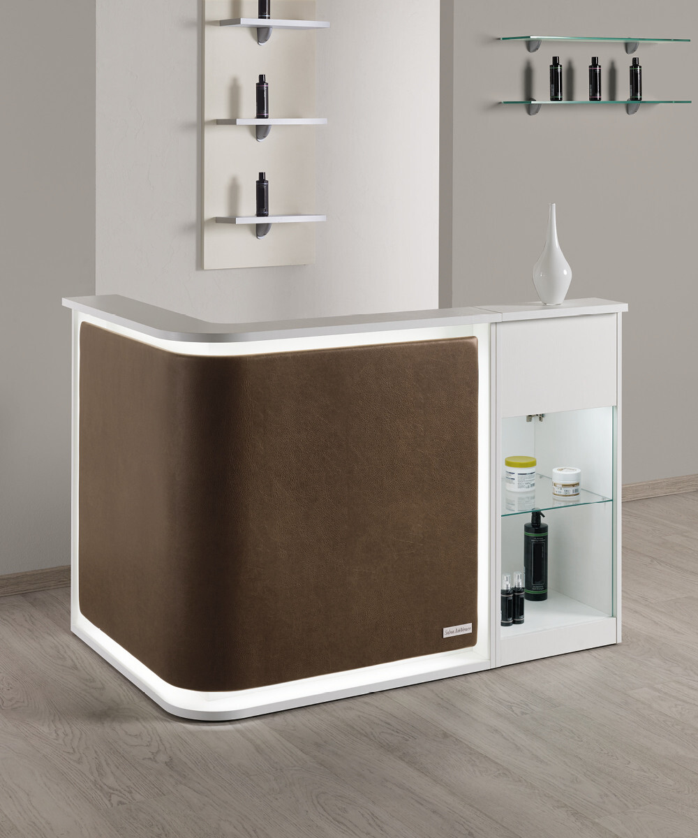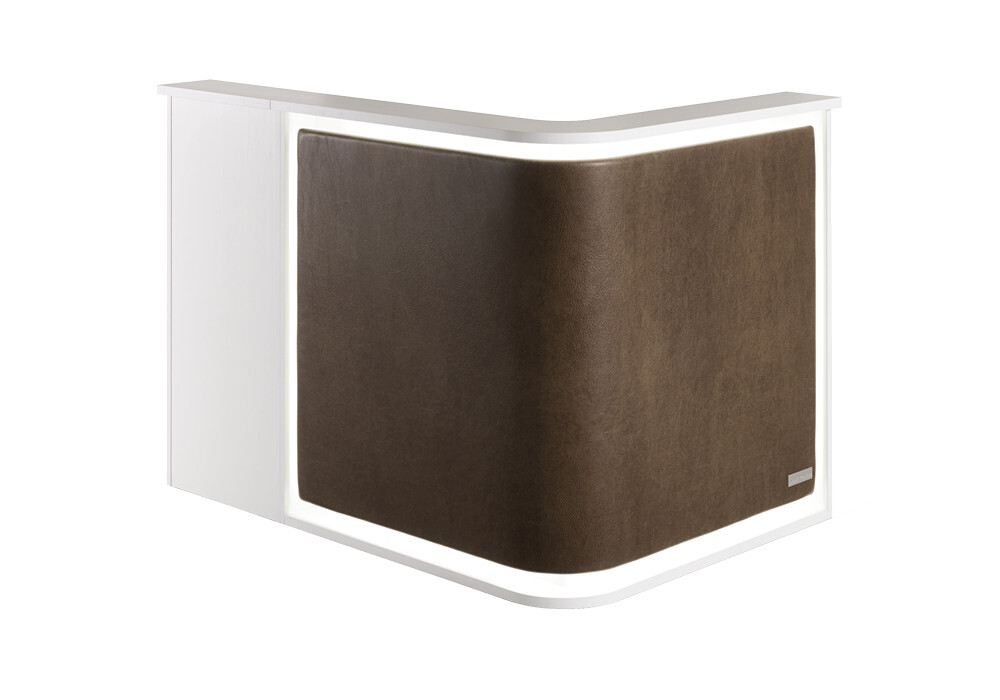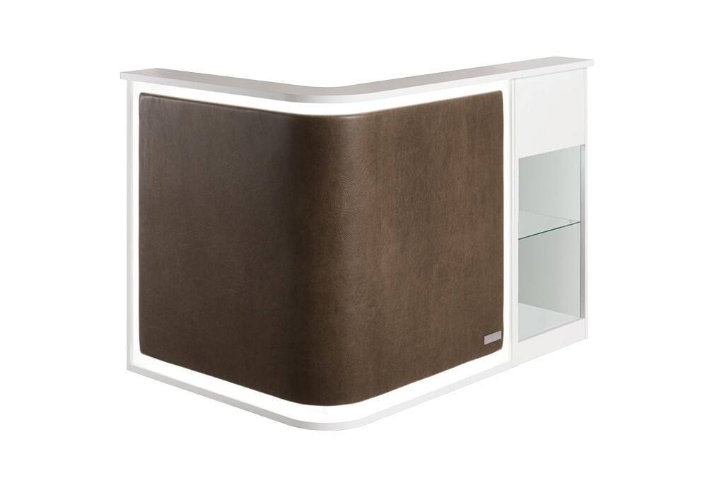 The Smart choice for the reception area has arrived! This stylish reception desk in white ash melamine commands attention upon entering the salon, with an upholstered front panel (available in a wide choice of colours) that curves at a 90° angle, allowing for the desk to be positioned in different ways, while still being compact enough to create extra space in the reception area. LED lighting beautifully accentuates the form of the upholstered front panel, while also adding importance to the reception desk. The Smart is also available with side display cabinets and side storage cabinets (also available separately).